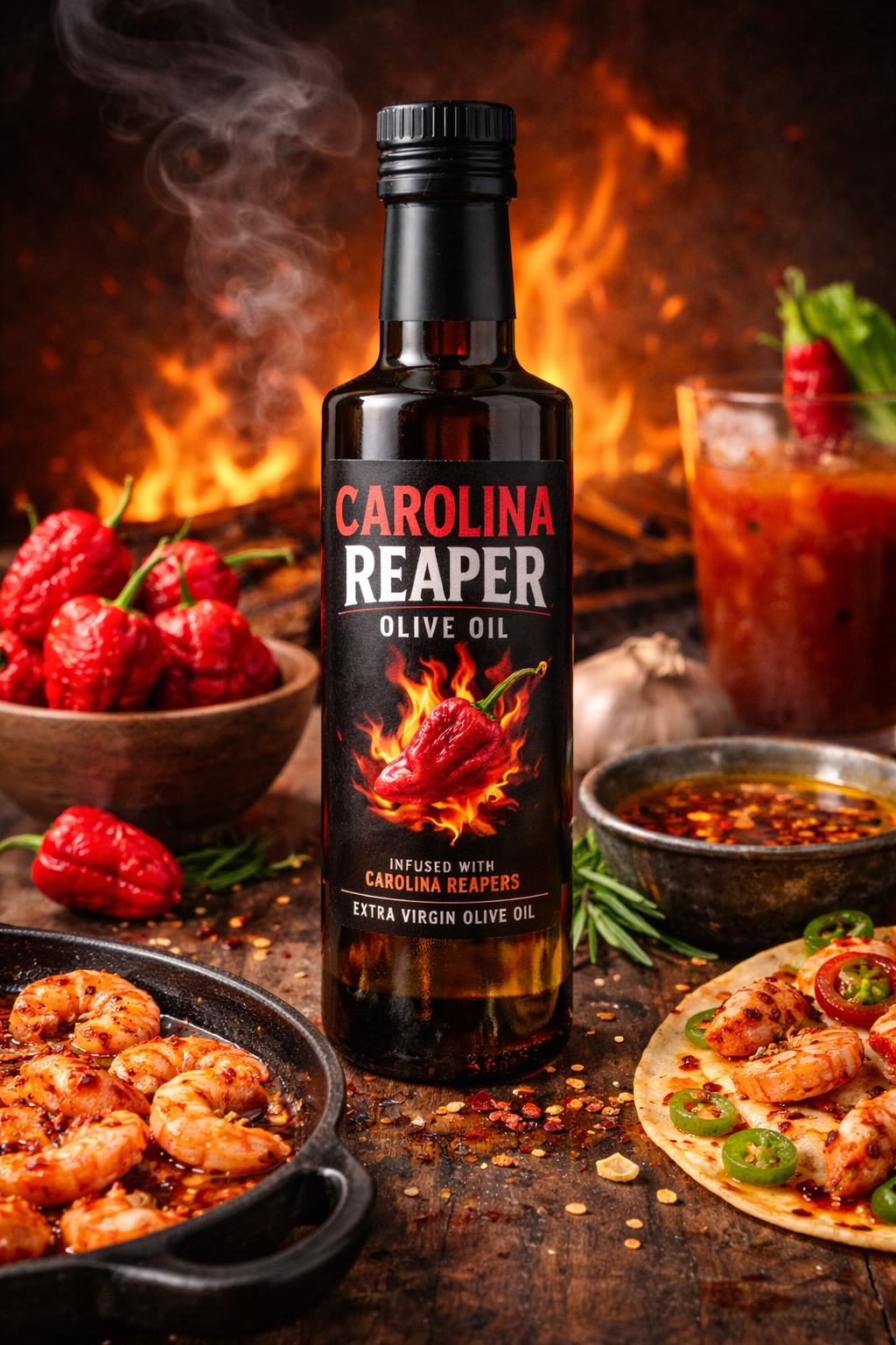 Infused with the world-famous Carolina Reaper, this olive oil delivers intense, lingering heat with surprisingly rich, savory depth. It’s bold, powerful, and designed for true heat enthusiasts who want more than just spice—they want flavor that lasts.